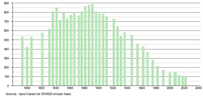 L'évolution du nombre d'habitants est connue à travers les recensements de la population effectués dans la commune depuis 1793. Pour les communes de moins de 10 000 habitants, une enquête de recensement portant sur toute la population est réalisée tous les cinq ans, les populations légales des années intermédiaires étant quant à elles estimées par interpolation ou extrapolation[21]. Pour la commune, le premier recensement exhaustif entrant dans le cadre du nouveau dispositif a été réalisé en 2007[22].