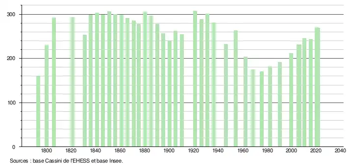 L'évolution du nombre d'habitants est connue à travers les recensements de la population effectués dans la commune depuis 1793. Pour les communes de moins de 10 000 habitants, une enquête de recensement portant sur toute la population est réalisée tous les cinq ans, les populations légales des années intermédiaires étant quant à elles estimées par interpolation ou extrapolation[18]. Pour la commune, le premier recensement exhaustif entrant dans le cadre du nouveau dispositif a été réalisé en 2005[19].