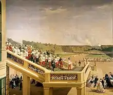L'empereur François-Joseph dans l'escalier du jardin lors de l'anniversaire des 100 ans de la fondation de l'Ordre militaire de Marie-Thérèse, 1857.
