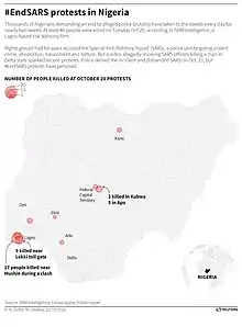 End SARS est un mouvement social décentralisé et une série de manifestations de masse contre la violence policière au Nigeria. Le slogan appelle à la dissolution de l'escouade spéciale anti-braquage (SARS).