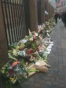 Fleurs en face de la Synagogue de Copenhague le lendemain de la fusillade.