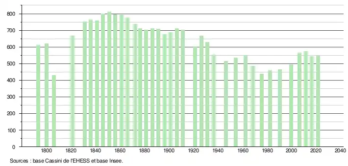 L'évolution du nombre d'habitants est connue à travers les recensements de la population effectués dans la commune depuis 1793. Pour les communes de moins de 10 000 habitants, une enquête de recensement portant sur toute la population est réalisée tous les cinq ans, les populations légales des années intermédiaires étant quant à elles estimées par interpolation ou extrapolation[26]. Pour la commune, le premier recensement exhaustif entrant dans le cadre du nouveau dispositif a été réalisé en 2006[27].