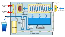 La capacité de production d’eau potable peut être améliorée dans des conditions d’air ambiant peu humide en utilisant un refroidisseur à évaporation avec une alimentation en eau saumâtre pour augmenter l’humidité de l’air à des niveaux proches du point de rosée. Ce système permet la génération d'eau potable à l'aide d'eau saumâtre indépendamment de l'humidité de l'air ambiant.