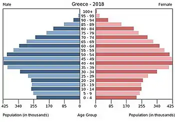 Le déséquilibre démographique de la Grèce est le résultat de difficultés économiques qui ont incité de nombreux jeunes à quitter le pays à la recherche de meilleures opportunités ailleurs. Entre 2009 et 2018, environ un demi-million de personnes ont quitté le pays, dont beaucoup en âge de procréer[57]. En 2010, 115 000 enfants sont nés ; ce nombre est tombé à 92 000 en 2015[58], puis à moins de 89 000 en 2017, le chiffre le plus bas jamais enregistré[57]. En 2019, le taux de fécondité est tombé à seulement 1,3 par femme, bien en dessous du seuil de remplacement et l'un des plus bas d'Europe. Certaines des régions les plus reculées de Grèce souffrent d'une pénurie d'obstétriciens et de gynécologues, dont beaucoup sont partis à l'étranger, ce qui dissuade les parents potentiels. Et il y a les élèves de l'école primaire qui sont le seul enfant de leur village et dont les parents ont la quarantaine. En général, les Grecs ont des enfants plus tard et ont moins d'enfants dans les années 2010 que dans les années 1980[57]. Cette fuite des cerveaux et le vieillissement rapide de la population pourraient créer des difficultés pour le pays[58].