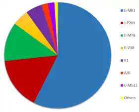 Les différents auteurs attribuent à l'haplogroupe J1, sous-groupe de J, que l'on trouve surtout dans l'Afrique de l'Est et en plus grand nombre dans la péninsule Arabique, et dont la fréquence dépasse parfois les 20 % dans certaines régions du Maghreb, en Libye surtout, une origine soit néolithique soit plus récente et due aux conquêtes arabes[19]. L'haplogroupe R1b (M269), présent surtout en Europe de l'Ouest arrive ensuite avec des fréquences entre 0 et 15 % selon les régions. Les principaux haplogroupes du chromosome Y des populations de l'Afrique du Nord berbérophones et arabophones sont : E1b1b1b (M81) et J1 (M267).