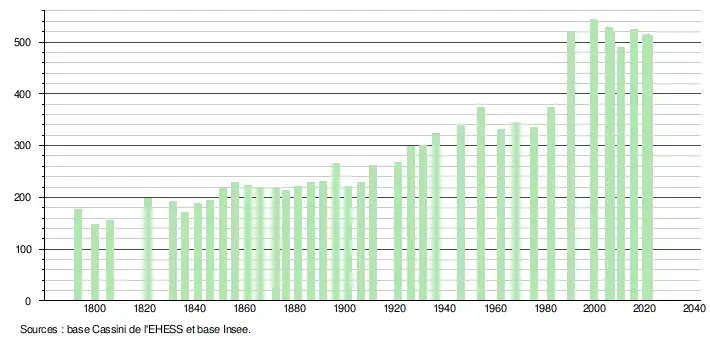 L'évolution du nombre d'habitants est connue à travers les recensements de la population effectués dans la commune depuis 1793. Pour les communes de moins de 10 000 habitants, une enquête de recensement portant sur toute la population est réalisée tous les cinq ans, les populations légales des années intermédiaires étant quant à elles estimées par interpolation ou extrapolation[26]. Pour la commune, le premier recensement exhaustif entrant dans le cadre du nouveau dispositif a été réalisé en 2005[27].