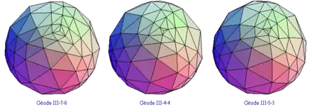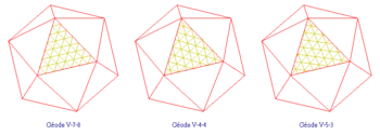 Dans le premier exemple, on a divisé les arêtes des faces de l'icosaèdre en deux segments. Dans le second, les arêtes ont été divisées en trois. Enfin, dans le dernier, elles ont été divisées en dix segments. C'est d'ailleurs sur ce dernier modèle qu'est bâtie la Géode de la Cité des sciences et de l'industrie de la Villette.
