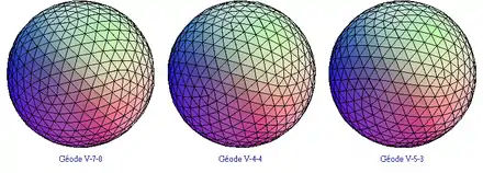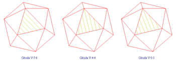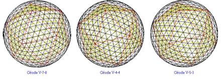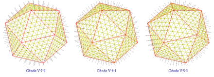- au paragraphe 1.1 : la géode V-1-0 (icosaèdre) puis les géodes V-2-0, V-3-0 et V-10-0 ;