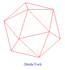 - Pour achever le tracé de la géode V-a-b, il suffit d'effacer la trace de toutes les opérations effectuées aux étapes nos 1 à 4 : les sommets des triangles sphériques restants sont les sommets de la géode ; ces sommets, reliés deux à deux, dessinent l'ensemble des sommets et des faces de la géode V-a-b.