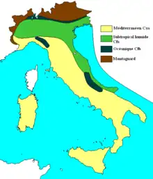 Du fait de sa position géographique, l'Italie a un climat tempéré[3], avec de fortes variations régionales dues aux écarts de latitude, aux reliefs et à l’influence de la mer. Les températures moyennes varient de 11 °C au nord (Turin) à 16 °C au sud (Naples), les précipitations de 1 000 à 2 000 mm dans la zone alpine à 600 mm sur le versant adriatique. D'une région à une autre, le climat est varié : montagnard au niveau des Alpes, méditerranéen dans la péninsule ou, selon la Classification de Köppen, subtropical humide dans le nord et l'est de la plaine du Pô. Le climat devenant de plus en plus sec vers le sud et sur la façade orientale de la botte (l'aridité en été dure 2 mois en Toscane, 5 mois en Calabre)[4]. Si les hivers sont assez froids dans le nord, ils sont doux dans le centre et dans le sud, avec toutefois des variations sensibles selon l'altitude. L'été est chaud partout, moite dans la plaine du Pô, et très sec dans les régions méditerranéennes, qui sont souvent marquées par des pluies assez importantes en automne. Les températures, comparables à la Grèce ou à l'Espagne, peuvent dépasser les 40° dans le sud. Le climat est lié au relief[5].