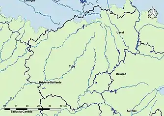 Le département de la Corrèze dispose de 5000 kilomètres de cours d'eau variés[2]. Ces cours d'eau sont nombreux (Corrèze, Vézère, Dordogne) et dépendent du réseau hydrographique de la Garonne. Ils connaissent un régime irrégulier, souvent torrentiel, et coulent au fond de vallées encaissées. Le climat de montagne présente déjà certains aspects méridionaux. Il reçoit des influences océaniques sensibles dans le bassin de Brive. Les pentes et vallées tournées vers l'Aquitaine bénéficient de conditions climatiques plus favorables.