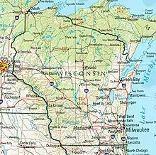 Le Wisconsin est situé dans le centre-est des États-Unis et est considéré comme faisant partie du Midwest. L'État a une superficie totale de 169 630 km2 , ce qui en fait le 23e plus grand État américain[2],[3]. 17% de cette superficie sont aquatiques, principalement le lac Michigan, le lac Supérieur et les nombreux lacs intérieurs que l'on trouve dans cet État[4].