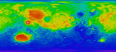 « Moho » calculé à partir des données topographiques et gravimétriques croisées avec l'évaluation de la densité locale de l'écorce martienne. Les couleurs indiquent une distance croissante au centre de la planète (soit une profondeur décroissante sous le niveau de référence) du bleu au blanc en passant par le vert, le jaune et le rouge ; il s'agit en quelque sorte de l'altitude de la surface du manteau. On voit ainsi que l'écorce est la plus épaisse dans les régions volcaniques, notamment sous le renflement de Tharsis avec un maximum dans la région d'Olympus Mons, tandis qu'elle est la plus fine sous les bassins d'Utopia, d'Isidis, d'Hellas et d'Argyre. La dichotomie crustale martienne affecte également de façon flagrante la topographie du Moho, bien que la limite entre les deux domaines ne se superpose pas exactement avec celle visible en surface. |
