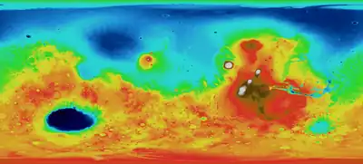 Topographie martienne vue par l'instrument MOLA de MGS. Les couleurs indiquent une altitude croissante du bleu au blanc en passant par le vert, le jaune, le rouge et le brun. Cette carte est bien connue, quoique généralement représentée avec le méridien 0° au centre, et non sur le bord gauche comme ici. On repère aisément le grand bassin d'impact d'Hellas Planitia en bleu marine en bas à gauche, Utopia Planitia dans le quart supérieur gauche, ainsi que le renflement de Tharsis dans la partie droite de la carte, avec en diagonale les trois volcans de la chaîne de Tharsis Montes qui apparaissent en blanc, ainsi que les grands volcans boucliers d'Olympus Mons (en blanc également) et d'Alba Mons (en brun et rouge au nord de l'ensemble). À droite de Tharsis sont visibles les canyons de Valles Marineris, au sud desquels le bassin d'Argyre Planitia apparaît en bleu ciel dans le quart inférieur droit de la carte. |