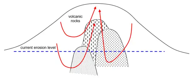 Tôt ou tard, l'activité volcanique cesse et l'érosion enlève les parties supérieures du volcan et expose les roches intrusives et la minéralisation de stockwerks qui s'y trouvaient autrefois[18].