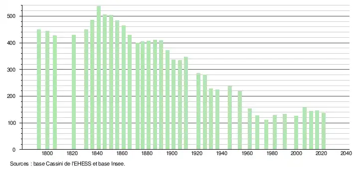 L'évolution du nombre d'habitants est connue à travers les recensements de la population effectués dans la commune depuis 1793. Pour les communes de moins de 10 000 habitants, une enquête de recensement portant sur toute la population est réalisée tous les cinq ans, les populations légales des années intermédiaires étant quant à elles estimées par interpolation ou extrapolation[35]. Pour la commune, le premier recensement exhaustif entrant dans le cadre du nouveau dispositif a été réalisé en 2006[36].