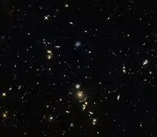 - Une deuxième hypothèse affirme que les BCG sont le résultat du cannibalisme galactique se produisant au centre des amas, phénomène engendré par la friction dynamique (en) et le dépouillement par effet de marée (en)[5].