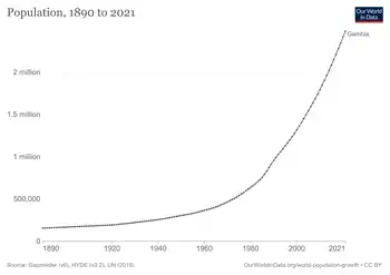 La population de la Gambie est estimée à 1,96 million d'habitants en 2015. La croissance démographique annuelle est de 2,2 % et le taux d’urbanisation est de 57 %. En 2013, elle est composée à 39,2 % de personnes de 0 à 14 ans, à 57,6 % de personnes de 15 à 64 ans et de 3,2 % de personnes de 65 ans ou plus. Sa densité humaine est de 167 hab./km2.