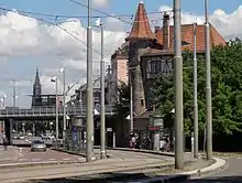 La station des lignes A et E du tramway de Strasbourg, la gare étant visible sur le pont.