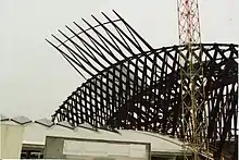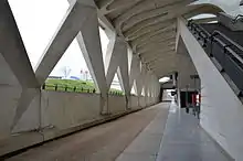 Le hall central situé transversalement à cet ensemble est recouvert d'une grande structure métallique formant deux ailes évasées de part et d'autre.
