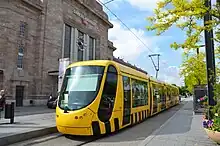 Vue d'ensemble de la façade du bâtiment voyageurs et de la station de tramway.