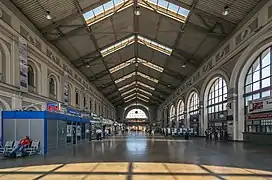 La gare est construite sur le modèle de la Gare de l'Est à Paris. La construction a commencé en 1854 et la mise en service a lieu le elle est alors nommée Peterhof. Elle dispose d'un toit en verre sur le terminal principal et est flanquée de deux ailes de chaque côté. Celle de gauche est réservée aux membres de la famille Royale russe lorsqu'ils se rendent à leurs palais de Strelna, Peterhof, Oranienbaum[1].