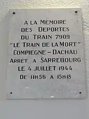 Le , le train de déportés no 7909 reliant Compiègne à Dachau (« train de la mort ») marque un arrêt à Sarrebourg[5].