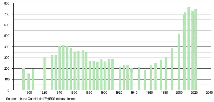 L'évolution du nombre d'habitants est connue à travers les recensements de la population effectués dans la commune depuis 1793. Pour les communes de moins de 10 000 habitants, une enquête de recensement portant sur toute la population est réalisée tous les cinq ans, les populations légales des années intermédiaires étant quant à elles estimées par interpolation ou extrapolation[27]. Pour la commune, le premier recensement exhaustif entrant dans le cadre du nouveau dispositif a été réalisé en 2007[28].