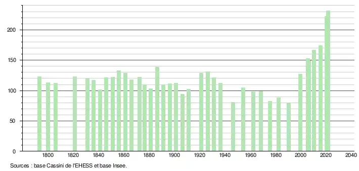 L'évolution du nombre d'habitants est connue à travers les recensements de la population effectués dans la commune depuis 1793. Pour les communes de moins de 10 000 habitants, une enquête de recensement portant sur toute la population est réalisée tous les cinq ans, les populations légales des années intermédiaires étant quant à elles estimées par interpolation ou extrapolation[26]. Pour la commune, le premier recensement exhaustif entrant dans le cadre du nouveau dispositif a été réalisé en 2005[27].