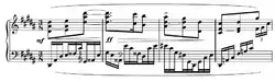 Dès la troisième mesure, le second thème, mélodique, lent vient par-dessus tout en étant « très doux et très expressif », et sera aussi métamorphosé à de multiples reprises tout au long de la pièce[13],[17],[18].