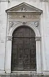 Le portail est conçu de manière excentrique tout en étant très élégant et presque exubérant. L'ensemble est sculpté de manière à laisser croire à un faux assemblage de vestiges archéologiques réutilisés[29],[30]. C'est pour ce motif que les critiques ne retiennent que Cairano comme l'inventeur du projet qui reste quand même en magnifique exemple de la culture antiquisante de l'époque[30],[31]. Gasparo est tout de même considéré comme l'auteur de la sculpture en ceci qu'on retrouve parmi les ornements des dauphins et des créatures fantastiques (dont Cairano s'était déjà servi auparavant) et l'artiste a aussi recours à de petits bustes de Césars, sur le portail comme sur la passerelle, qui ressemblent beaucoup à ses anciens bustes[29],[30].