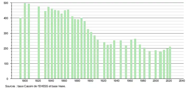 L'évolution du nombre d'habitants est connue à travers les recensements de la population effectués dans la commune depuis 1793. Pour les communes de moins de 10 000 habitants, une enquête de recensement portant sur toute la population est réalisée tous les cinq ans, les populations légales des années intermédiaires étant quant à elles estimées par interpolation ou extrapolation[36]. Pour la commune, le premier recensement exhaustif entrant dans le cadre du nouveau dispositif a été réalisé en 2007[37].