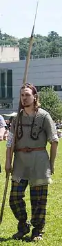 Le vêtement gaulois est principalement[notes 4] constitué d'une tunique avec des motifs en petits carreaux serrés et teints (teintures végétales donnant surtout du jaune, vert, rouge de garance, voire du brun ou noir grâce à la noix de galle). Cette tunique (généralement courte pour les hommes et une robe allant jusqu'aux chevilles pour les femmes) est serrée à la taille par une ceinture en tissu. Les chausses sont des braies ou des bas en tissu de laine ou de lin. L'hiver, il revêt le sayon[notes 5], sorte de casaque décorée, parfois multicolore, s'agrafant par une fibule. Les chaussures ou bottines sont en cuir[50].