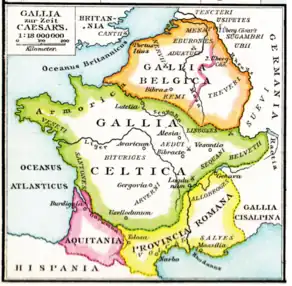 Au milieu du Ier siècle av. J.-C. Jules César divise la Gaule transalpine en trois parties : la Gaule celtique, la Gaule aquitaine et la Gaule belgique (cf. carte). Ce découpage schématique correspondait à des considérations géopolitiques propres aux Romains, Strabon qui fournit des délimitations différentes le précise en au moins deux occasions[24],[25]. Si la Gaule proprement dite apparaît sous la plume des Romains, elle trouve sa définition arbitraire actuelle à travers l'histoire de sa conquête par ces derniers. La Gaule est en effet une pure invention de César voulant que sa conquête soit perçue comme un ensemble homogène, doté d'une frontière qualifiée de naturelle mais qui n'a aucun sens, le Rhin, fleuve délimitant un nouveau territoire qu'il nomme Germanie[26].