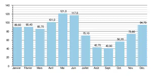 La rivière présente des fluctuations saisonnières de débit caractéristiques, liées à son régime partiellement nival. Les hautes eaux de printemps portent le débit mensuel à des valeurs allant de 101 à 121 m3/s, d'avril à juin inclus (avec un sommet léger en mai). Elles sont dues essentiellement à la fonte des neiges, bien que des pluies se produisent également. Dès le mois de juillet, le débit baisse rapidement pour atteindre un plancher en août (40,9 m3/s). Dès septembre le débit remonte lentement vers un petit sommet de novembre (94,7 m3/s) puis baisse à nouveau sous l'effet de l'hiver et atteint son minimum en mars (85,7 m3/s), minimum qui reste toujours franchement abondant.