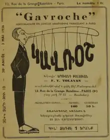 Gavroche (en arménien Կավռօշ) est un journal satirique de langue arménienne fondé en 1908 par Yervant Tolayan (1883-1937), Krikor Torossian et Aram Andonian (1875-1951) à Constantinople[1]. Yervant Tolayan, son animateur principal et rédacteur en chef, s'installe en France en 1925 et y reprend la publication de son journal entre 1926 et 1936.