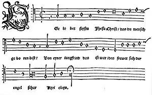 La mélodie fut publiée pour la première fois avec le texte en 1524, mais elle apparaît également dans les livres de prières du couvent de Medingen. Il est probable que Luther et Walter aient travaillé de concert pour modifier une vieille mélodie. La mélodie accentue les mots plus importants de la première strophe, tel Jesu, Mensch (homme), Jungfrau (vierge) et Engel (anges).