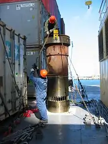 Saisissage d'une chemise de moteur sur le pont d'un porte-conteneurs