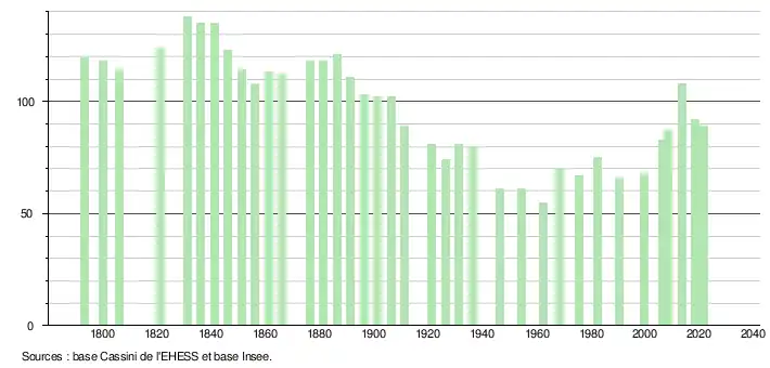 | L'évolution du nombre d'habitants est connue à travers les recensements de la population effectués dans la commune depuis 1793. Pour les communes de moins de 10 000 habitants, une enquête de recensement portant sur toute la population est réalisée tous les cinq ans, les populations légales des années intermédiaires étant quant à elles estimées par interpolation ou extrapolation[31]. Pour la commune, le premier recensement exhaustif entrant dans le cadre du nouveau dispositif a été réalisé en 2008[32]. En 2021, la commune comptait 89 habitants[Note 7], en diminution de 18,35 % par rapport à 2015 (Hautes-Pyrénées : +1,04 %, France hors Mayotte : +1,84 %). |