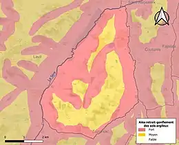 Le retrait-gonflement des sols argileux est susceptible d'engendrer des dommages importants aux bâtiments en cas d’alternance de périodes de sécheresse et de pluie. La totalité de la commune est en aléa moyen ou fort (92 % au niveau départemental et 48,5 % au niveau national). Sur les 58 bâtiments dénombrés sur la commune en 2019, 58 sont en aléa moyen ou fort, soit 100 %, à comparer aux 96 % au niveau départemental et 54 % au niveau national. Une cartographie de l'exposition du territoire national au retrait gonflement des sols argileux est disponible sur le site du BRGM[23],[Carte 3].