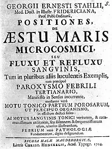 Georg Ernst Stahl (né à Ansbach le - mort à Berlin ) est un médecin et chimiste allemand, promoteur d'un système médical, l'animisme de Stahl, qui en fait un précurseur du vitalisme médical ; et d'une théorie chimique erronée, celle du phlogistique. C'est l'une des figures les plus controversées de l'histoire de la médecine et de la chimie[1].
