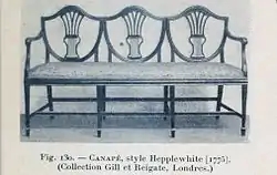 Georges Heppelwhite diffusa le style de Robert Adam qui travaillait principalement pour l’aristocratie. Il popularisa la chaise à dossier découpé en écusson où figurent fréquemment trois plumes, emblème du prince de Galles[2].