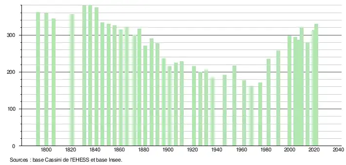 L'évolution du nombre d'habitants est connue à travers les recensements de la population effectués dans la commune depuis 1793. Pour les communes de moins de 10 000 habitants, une enquête de recensement portant sur toute la population est réalisée tous les cinq ans, les populations légales des années intermédiaires étant quant à elles estimées par interpolation ou extrapolation[22]. Pour la commune, le premier recensement exhaustif entrant dans le cadre du nouveau dispositif a été réalisé en 2004[23].