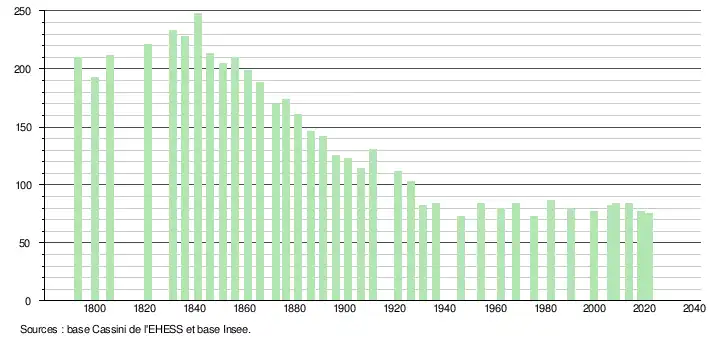 L'évolution du nombre d'habitants est connue à travers les recensements de la population effectués dans la commune depuis 1793. Pour les communes de moins de 10 000 habitants, une enquête de recensement portant sur toute la population est réalisée tous les cinq ans, les populations légales des années intermédiaires étant quant à elles estimées par interpolation ou extrapolation[15]. Pour la commune, le premier recensement exhaustif entrant dans le cadre du nouveau dispositif a été réalisé en 2008[16].