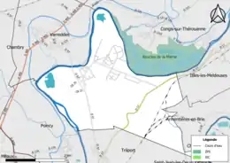 C'est une séparation avec la commune de Varreddes au nord-ouest et, avec la commune de Congis-sur-Thérouanne au nord-est (un bras de la Marne de 1,01 km[5]). À l'ouest, la Marne se divise en deux bras, formant l'île Françon. Le bras de la rivière le plus à l'ouest, 1,48 km[6], délimite le territoire avec celui de Poincy. Le fossé 01 de la Motte l'Abbesse, 2,20 km[7] délimite la commune avec Armentières-en-Brie.