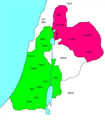 (Les frontières, notamment celles du royaume d'Agrippa, sont approximatives, de même que la position précise de la Batanée, la Gaulanitide, l'Auranitide, la Trachonitide et l'Iturée)