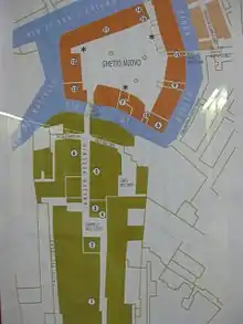 Le , le sénateur Zaccaria Dolfin propose de les confiner sur une île dans le quartier de Cannaregio. Le , le Sénat de la République de Venise publie un décret pour fondation du ghetto dans ce quartier[13]. Le choix du site est déterminé par sa situation à la périphérie de la ville et par le fait qu'il n'abrite pas d'église chrétienne et qu'il est facile à contrôler grâce à la construction de deux portes qui sont fermées le soir[14]. Les Juifs sont parqués la nuit[15] autant pour les protéger que pour les surveiller[16]. Ils doivent en outre porter un habit distinctif, une rouelle jaune remplacée quelques années plus tard par un béret de la même couleur[1]. La communauté devra également s’acquitter chaque année de la somme de 14.000 ducats. La résidence dans ce quartier est également imposée aux Juifs vénitiens dans le but de subir une prédication forcée par les ordres prêcheurs et mendiants, un courant théologique minoritaire, mais appuyé par plusieurs décisions papales affirmant que la parousie aurait lieu une fois que tous les Juifs auront été convertis au christianisme[17].