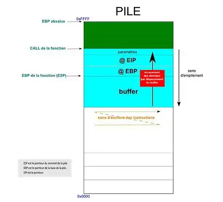 La grande différence entre ces deux zones est le sens d’empilement : il est croissant pour le tas, et décroissant pour la pile. Pour la pile, la première adresse empilée possède la valeur la plus grande, et la dernière adresse empilée possède la valeur la plus faible. Comme le sens de lecture de la mémoire reste dans le sens croissant, un dépassement de tampon dans la pile permet alors l’écrasement des registres contenant EBP et EIP. Par ce principe, un pirate peut remplacer la valeur d’EIP par une adresse pointant vers du code malveillant logé dans la zone tampon utilisée. Néanmoins, cela demande au pirate de connaitre l’adresse exacte de la pile pour assurer le saut d’adresse utilise à l’exécution de son code arbitraire[8].
