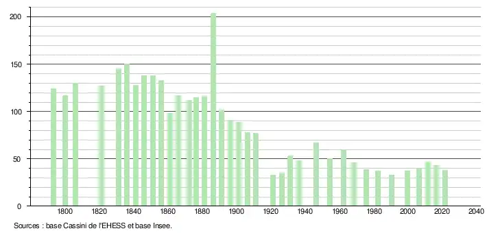 L'évolution du nombre d'habitants est connue à travers les recensements de la population effectués dans la commune depuis 1793. Pour les communes de moins de 10 000 habitants, une enquête de recensement portant sur toute la population est réalisée tous les cinq ans, les populations légales des années intermédiaires étant quant à elles estimées par interpolation ou extrapolation[20]. Pour la commune, le premier recensement exhaustif entrant dans le cadre du nouveau dispositif a été réalisé en 2006[21].
