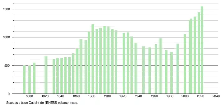 | L'évolution du nombre d'habitants est connue à travers les recensements de la population effectués dans la commune depuis 1793. Pour les communes de moins de 10 000 habitants, une enquête de recensement portant sur toute la population est réalisée tous les cinq ans, les populations légales des années intermédiaires étant quant à elles estimées par interpolation ou extrapolation[27]. Pour la commune, le premier recensement exhaustif entrant dans le cadre du nouveau dispositif a été réalisé en 2007[28]. En 2021, la commune comptait 1 547 habitants[Note 3], en augmentation de 12,59 % par rapport à 2015 (Aude : +2,47 %, France hors Mayotte : +1,84 %). |